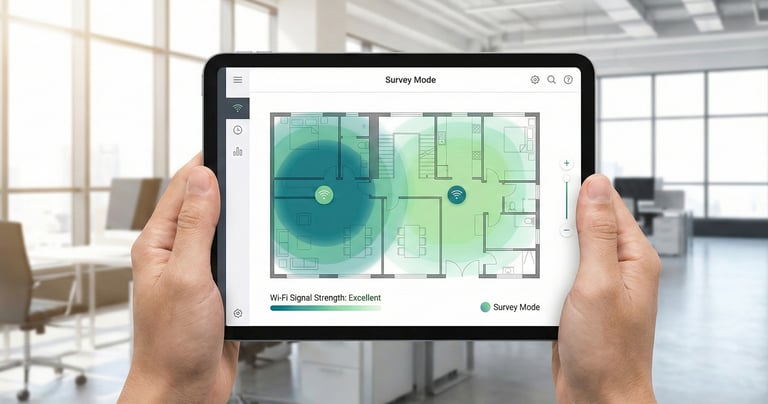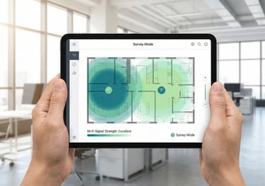 We conduct professional wireless site surveys using Wi-Fi 6 and Wi-Fi 7 heat-mapping to eliminate dead zones. Our surveys optimise coverage, capacity, and performance for high-density enterprise environments.The result is reliable, high-performance wireless connectivity across your workspace.